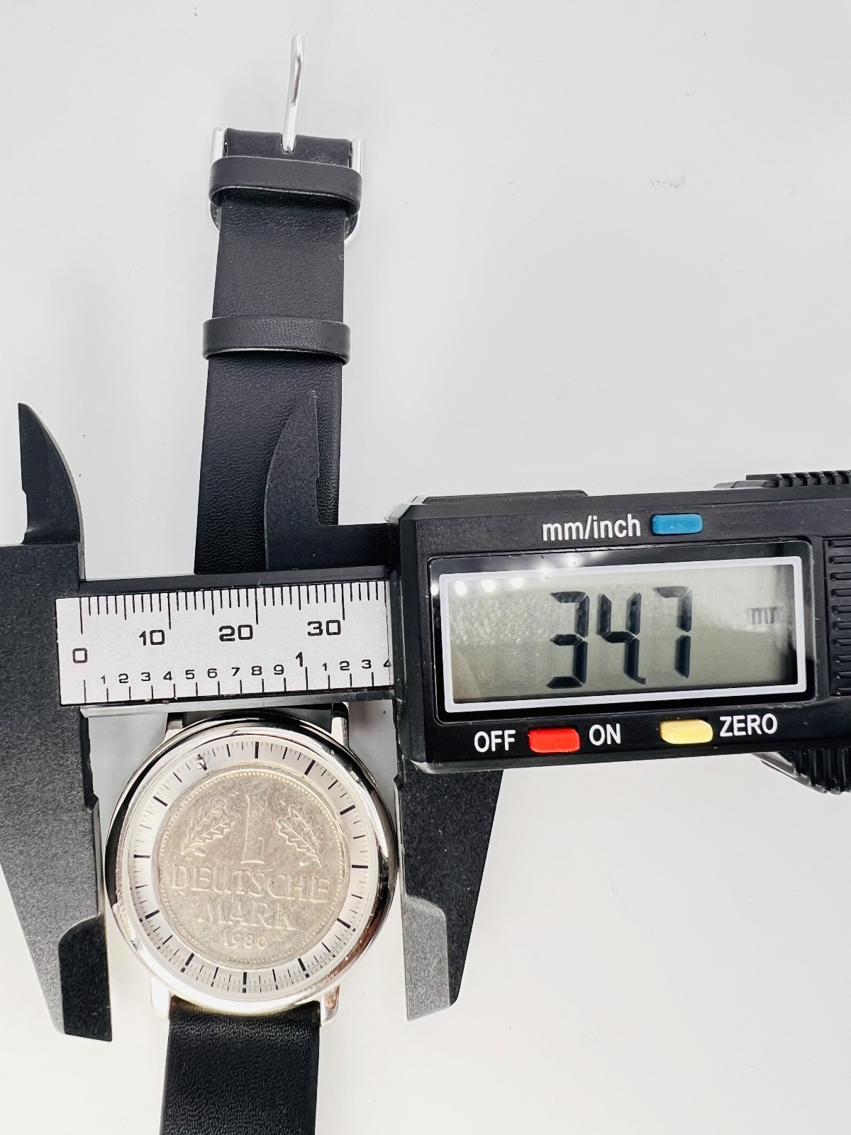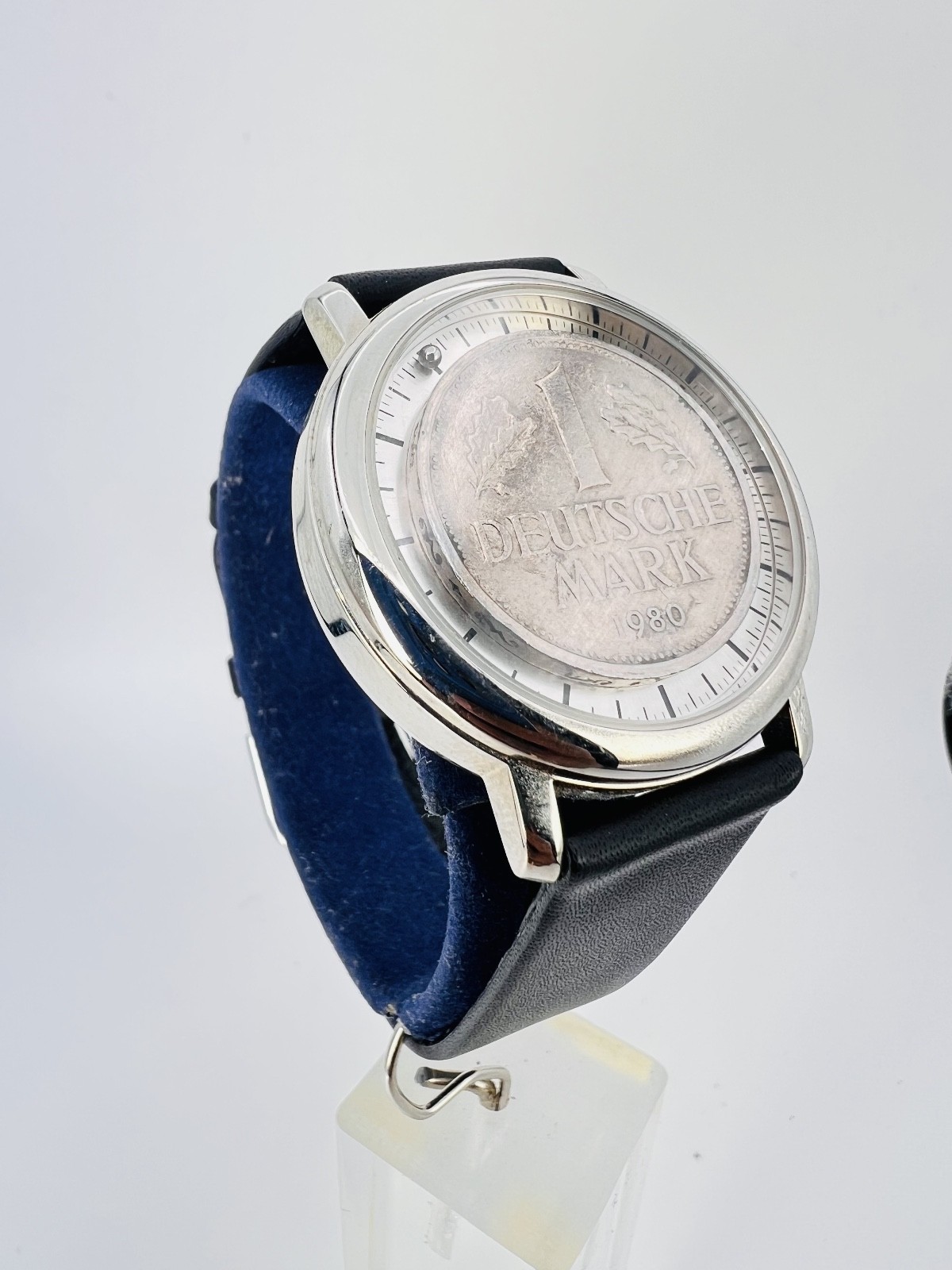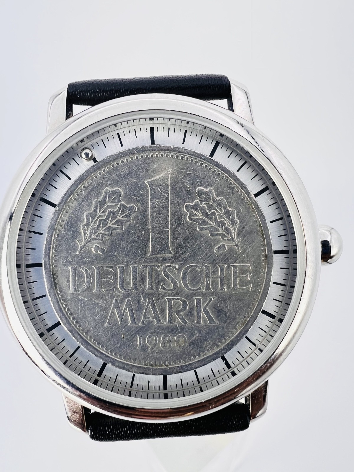 Originelle Uhr mit einem echten DM Stück. Die Zeit wird an den zwei kleinen Kugeln abgelesen.